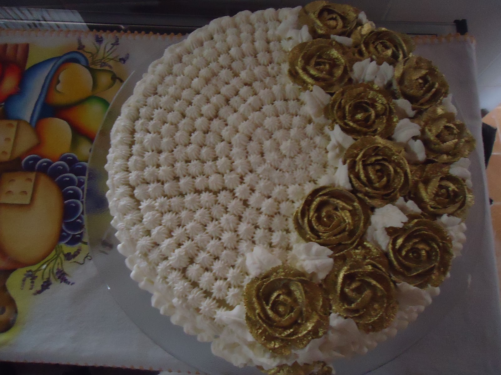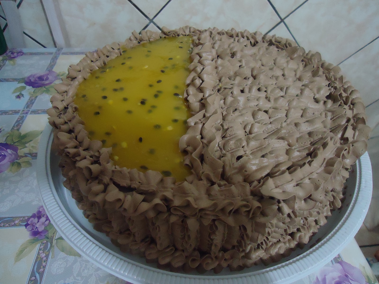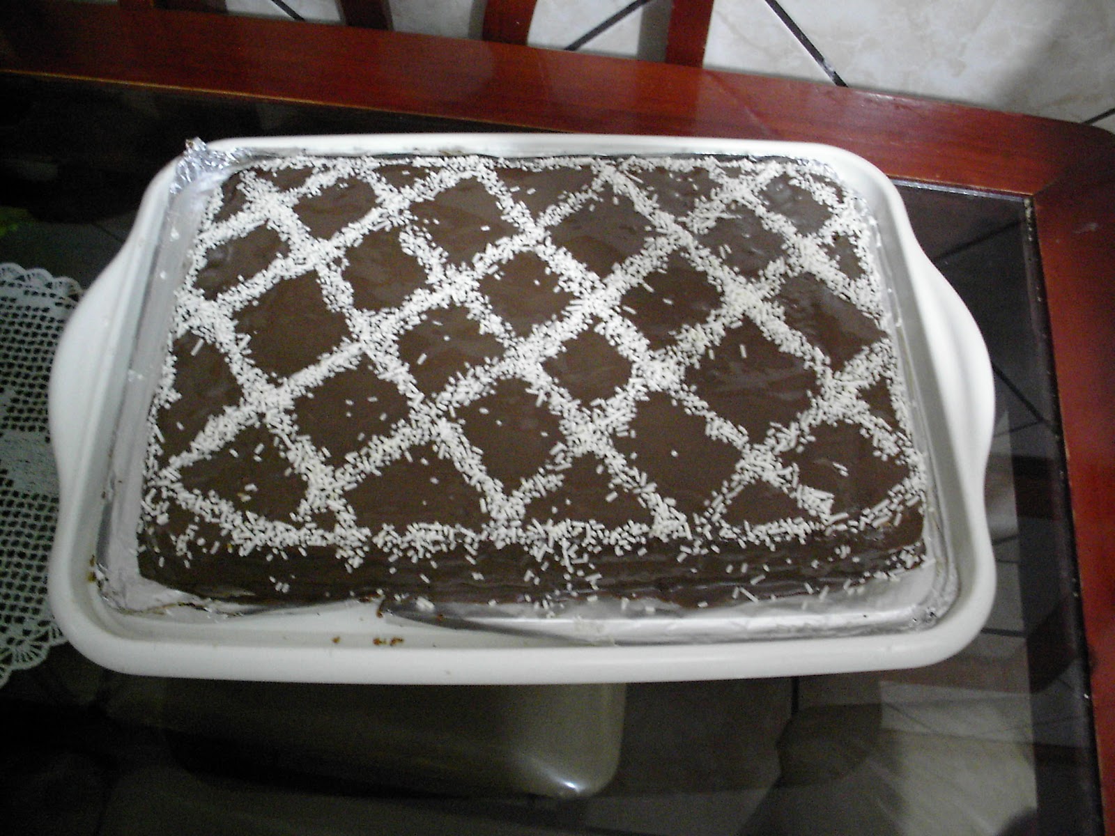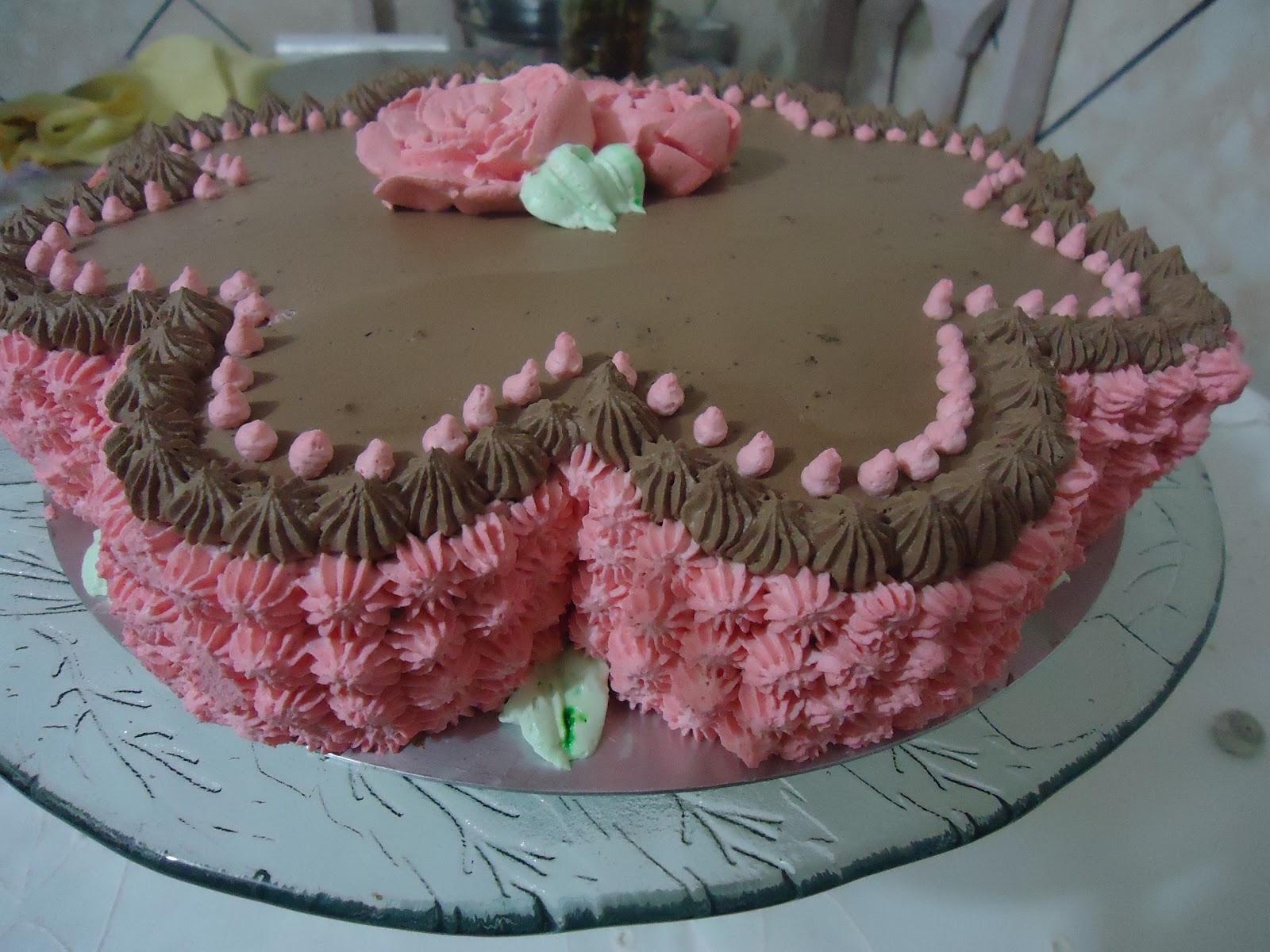 Bolo massa de chocolate com recheio de doce de leite com coco e cobertura de pasta americana e flores da mesma. R$ 35,00 o quilo.