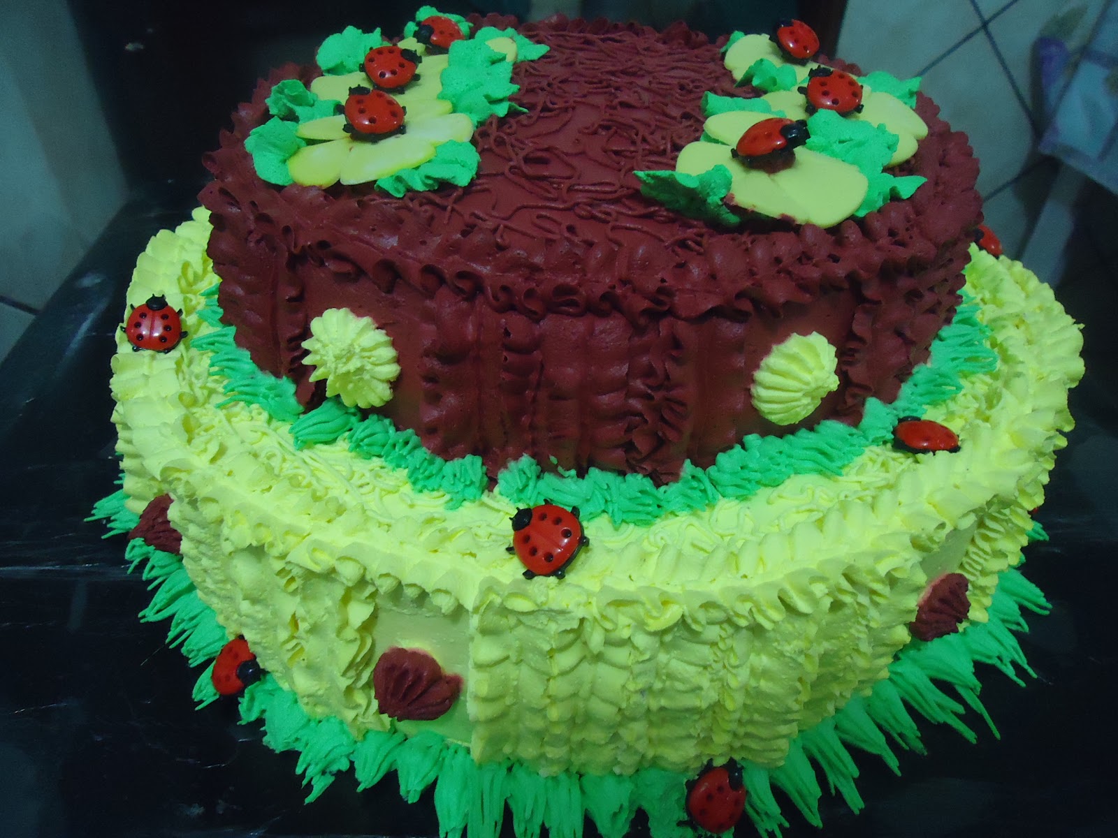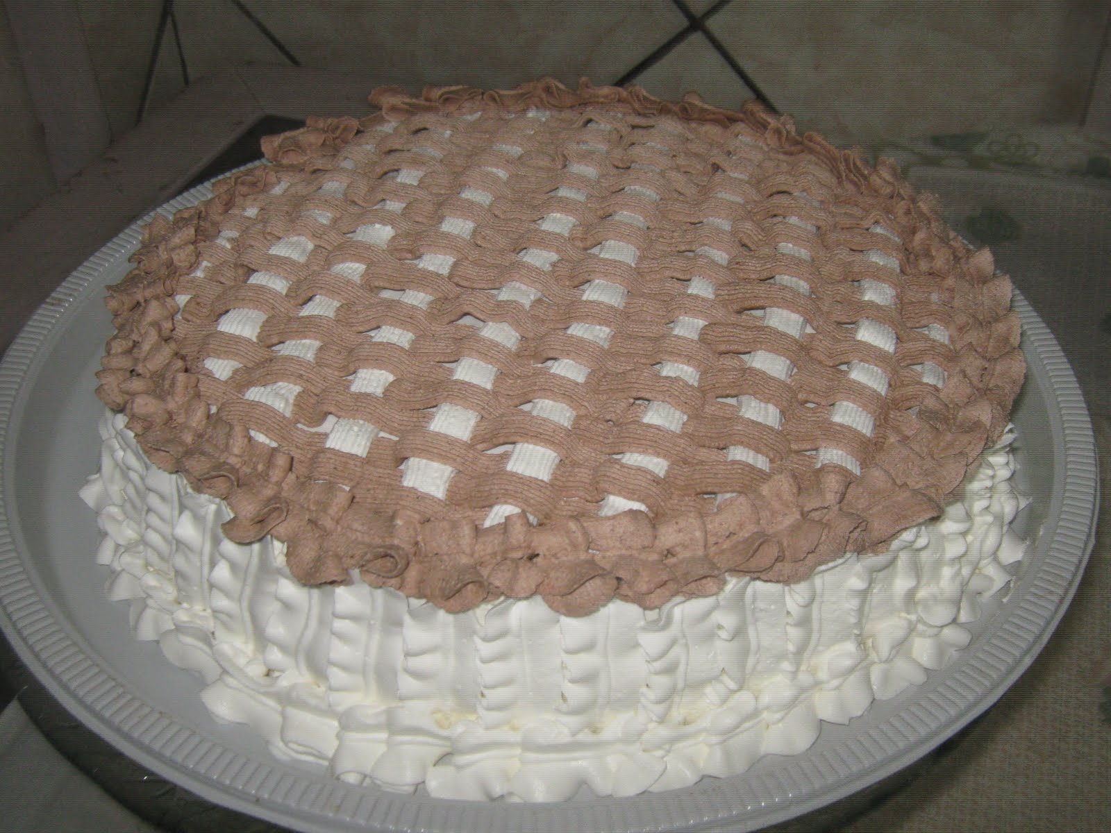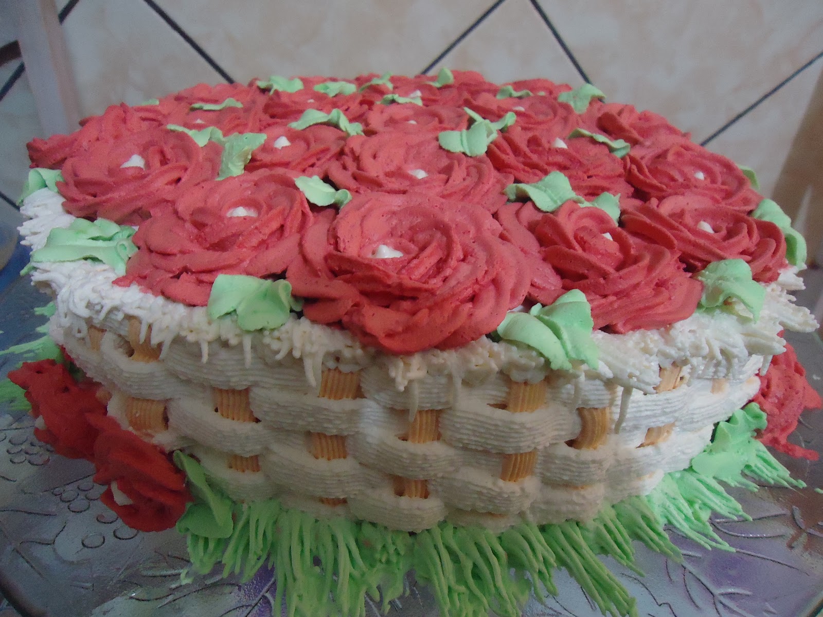 Bolo massa de chocolate com recheio de doce de leite com coco e cobertura de pasta americana e flores da mesma. R$ 35,00 o quilo.